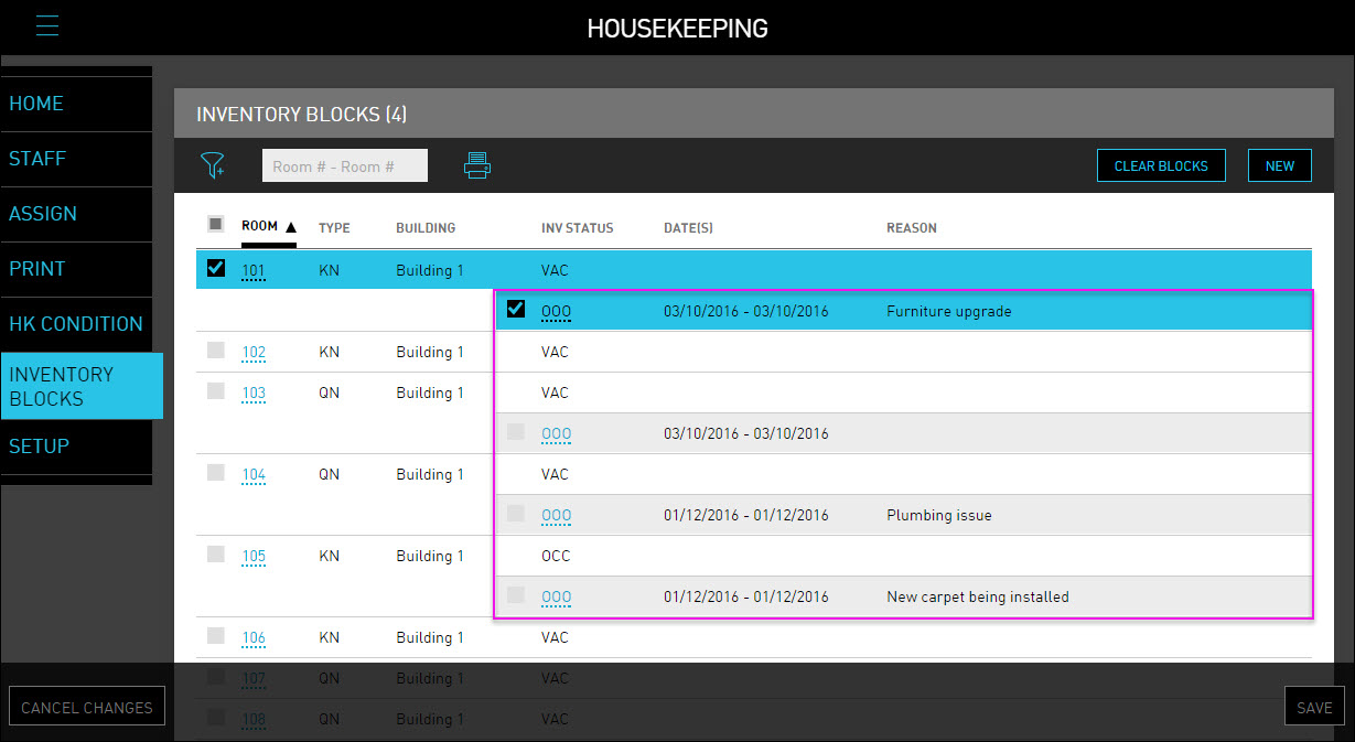 Navigate to Rooms Mgmt ➜ Housekeeping ➜ Blocks. Rooms that are currently blocked are highlighted in gray with the inventory status, dates, and reason.
