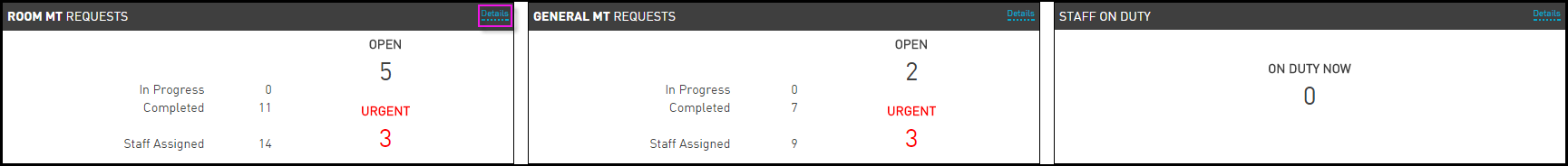 Click Details or the maintenance request dashboard to view detail of the request. The following details are displayed in the Room MT Service Requests grid: