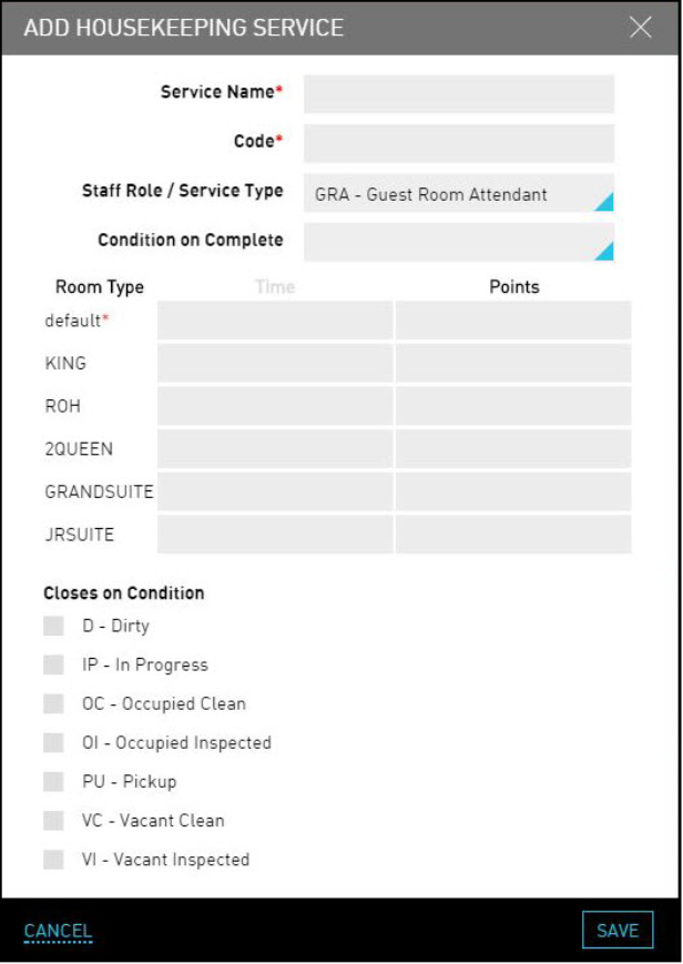 Select the appropriate Closes on Condition type to indicate that a service is complete when a room status is changed to that type. For example, the Full-Service type is completed when the room status changes to Vacant Clean (VC) or Vacant Inspected (VI).