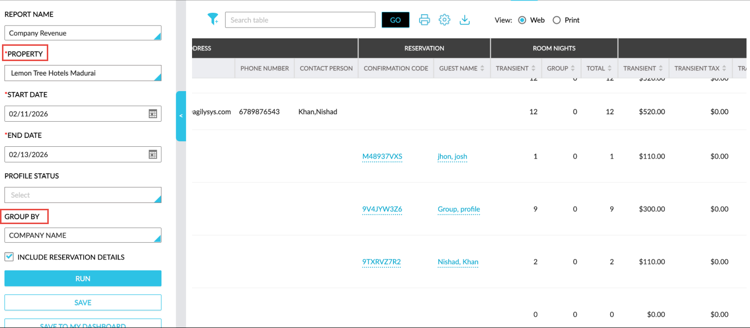 When selected, the records in the generated report are grouped based on the company name. An accordion is displayed for each company name that displays the company profile name as a hyperlink when expanded. When users click on the hyperlink and when a single property is selected, they will be navigated to the profile in the currently logged-in property.